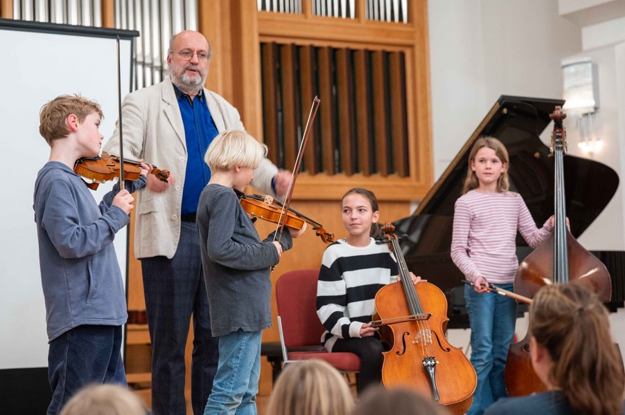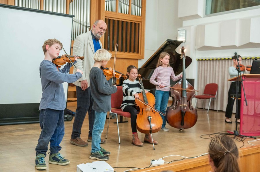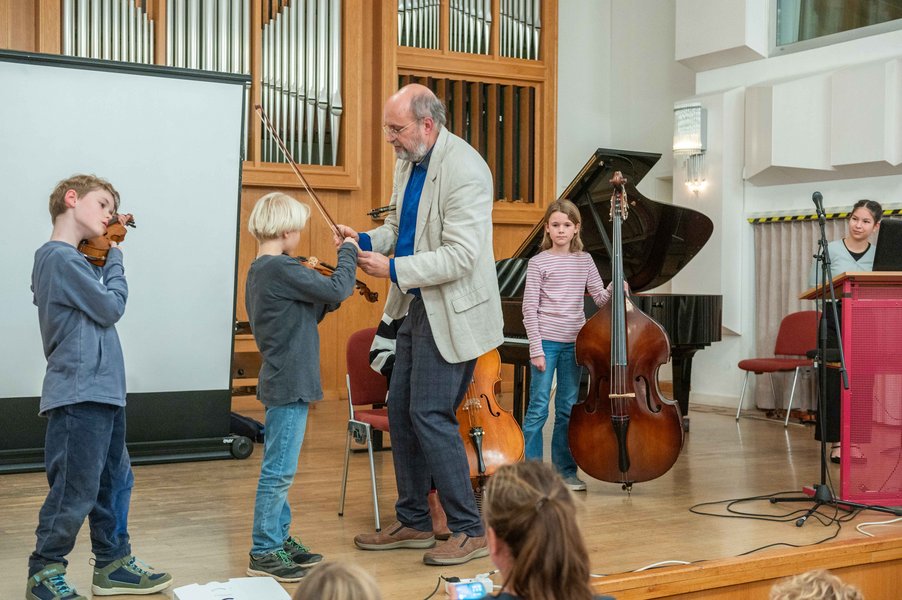 Die Vorlesung war sehr anschaulich gestaltet. Es gab viel Hintergrundwissen über die Familie der Streichinstrumente und es konnten sogar die verschiedenen »Familienmitglieder« vor Ort auf der Bühne ausprobiert werden. Fotos: Maik Schuck